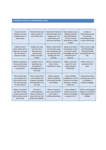 Summer Holiday Homework Ideas Teaching Resources
